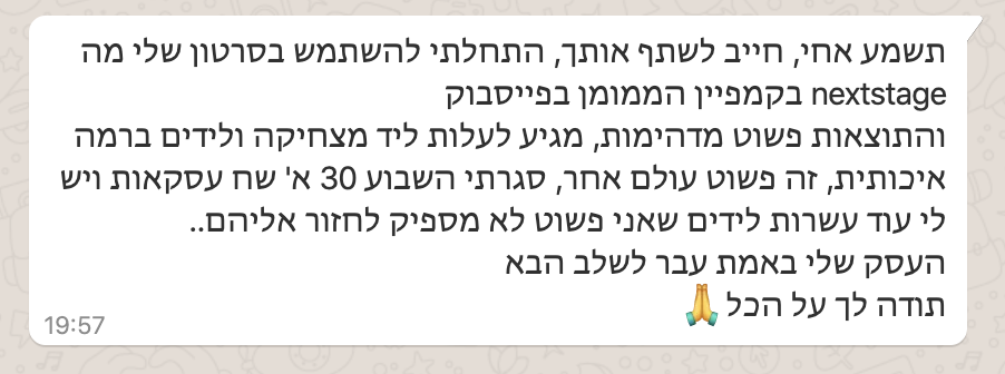 "מיד אחרי ההרצאה, ניגשו אלי 3 אנשים שהתעניינו בשירות שלי, וסירטון ההרצאה עזר לי לגייס שני לקוחות פרימיום, בשבוע הראשון להפצה שלו"